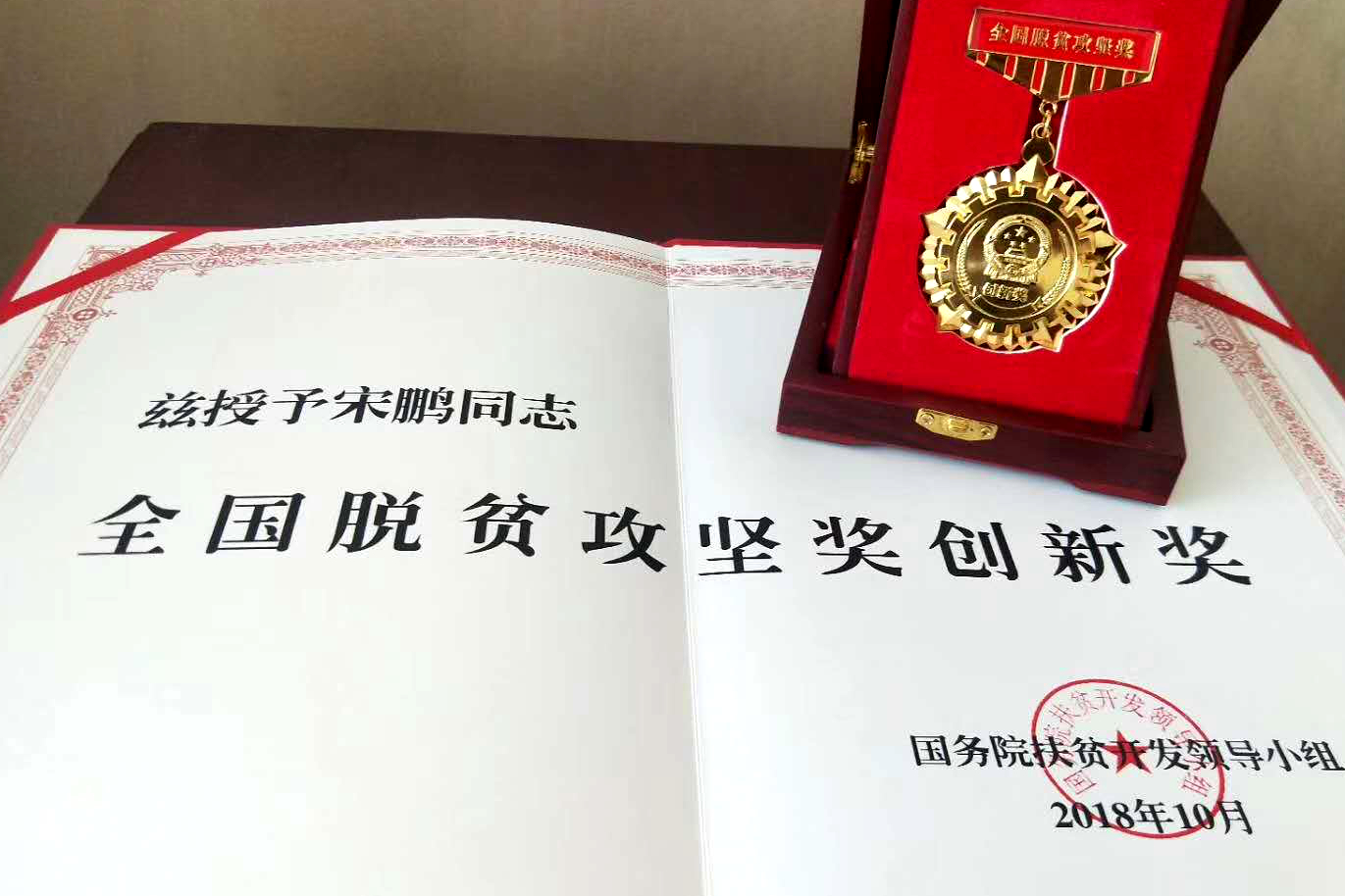 全国脱贫攻坚奖是脱贫攻坚领域的“国家级”荣誉,被誉为“扶贫第一奖”。今年是国务院扶贫开发领导小组连续第三年开展全国脱贫攻坚奖评选表彰工作,从3000多名申报个人及单位中评选表彰个人99名、集体40个。该奖细分为“奋进奖”、“贡献奖”、“奉献奖”、“创新奖”、“组织创新奖”等奖项。宋鹏荣获的“创新奖”从扶贫脱贫主体中产生,旨在表彰在实施精准扶贫精准脱贫方略中理论与实践创新的先进典型。(编辑 焦德芳)