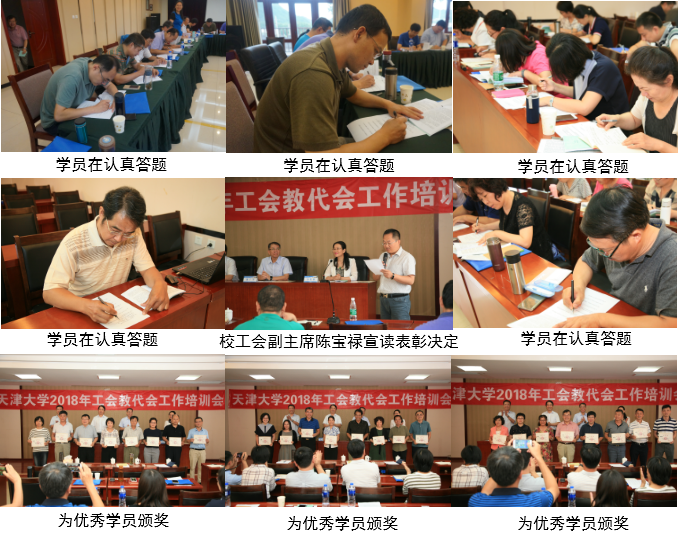 培训期间,全体学员认真学习理论知识,交流工作经验,涌现了一批先进典型。为检验培训成果,校工会组织了教代会工会知识测试。综合学员们在培训学习、卷面成绩和参与讨论发言过程中的总体情况,校工会评选宋轶民等24名学员为天津大学2018年度工会教代会培训优秀学员。