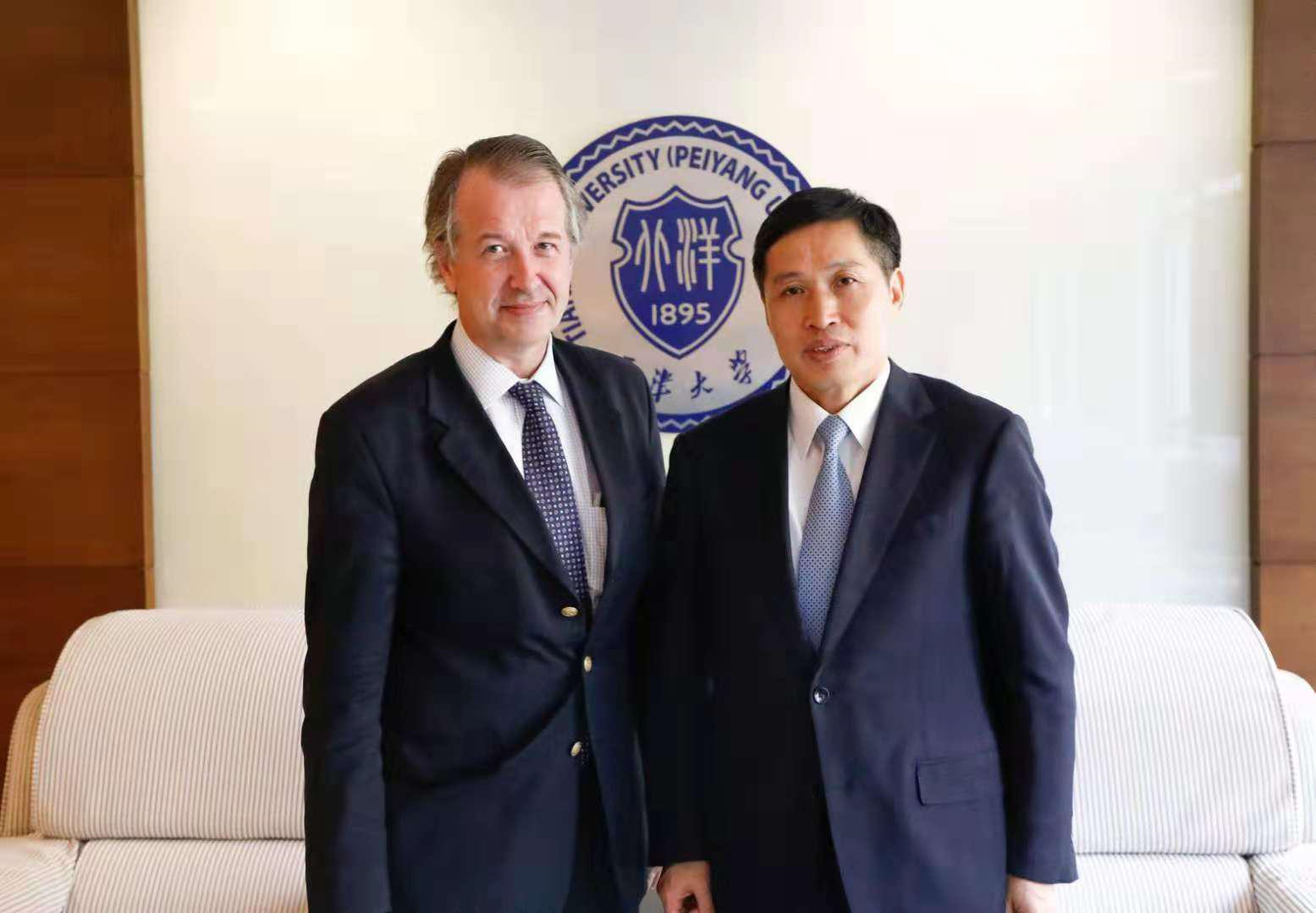 钟登华对菲利普·顾伯维尔的再次到访表示欢迎,并高度肯定了顾伯维尔在国际工程师学院建设过程所作出的努力与贡献。顾伯维尔对钟登华的欢迎和肯定表示感谢,并向钟登华详细汇报了天津大学与法国尼斯综合理工学院在多学科交叉融合的工科专业建设中的探索与进展。
