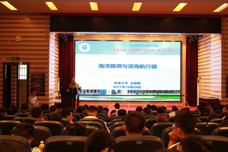 这是10月29日湖南雅礼中学和长沙市一中的主题报告现场,天津大学副校长王树新以丰富的图片、形象的视频短片、风趣而严谨的讲解为师生以及学生家长揭秘了深海航行器的基本分类、工作原理,使中学生对深海航行器有了更加具体的认识。报告中,他谈到,我国在深海无人潜航器方面的研究走在了国际前列,天津大学牵头研制的“海燕”号水下滑翔机作为其代表之一,运用浮力驱动与螺旋桨驱动作为混合驱动,创造了中国水下滑翔机无故障航程最远、时间最长、剖面运动最多、工作深度最大等诸多纪录。他鼓励中学生抓住身边机会尝试科学探索和创新实践。他表示,科学研究过程中运到的很多原理其实是中学生早已牢牢掌握的物理定律、数学知识,科学研究离大家并不遥远。