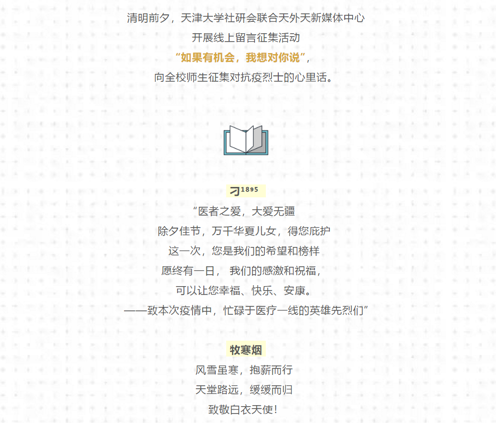 4月3日,校社研会联合天外天媒体中心开展线上留言征集活动,向全校师生征集对抗疫烈士的致敬与悼念感悟,用留言代替黄菊,寄托对英雄先烈的哀思,得到广大学生的积极响应。4月7日,校社研会和天外天媒体中心对征集的留言进行推送,同时开展为抗疫英烈线上献花活动,得到广泛转发。“医者仁心,慈悲济世,白袍作战甲,舍己救苍生。感谢所有曾经或者正在奋战一线的医务工作者,你们的奉献我将永远铭记,永远感恩。”智能与计算学部2017级本科生吕思雨在“天外天”微信公众平台上留言道。
