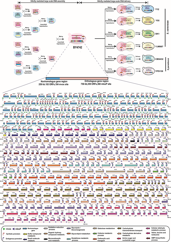 该研究开发了一种在二倍体酵母中选择性删除一套基因组的方法,实现了不需要自然减数分裂过程的快速单倍体化。在此基础上,团队开发了一种易于使用的大尺度DNA组装和递送技术——HAnDy (Haploidization based DNA Assembly and Deliveryin yeast基于酵母单倍体化的DNA组装与转移),该方法可以高效地组装和递送大尺度DNA。与其他组装策略相比,HAnDY是一种易于使用、与组装片段尺寸无关的组装方法,无需任何繁琐的体外操作。此外,该方法还可以通过在交配过程中选择性地消除供体菌株的基因组以作为一种酵母间大尺度DNA转移方法。