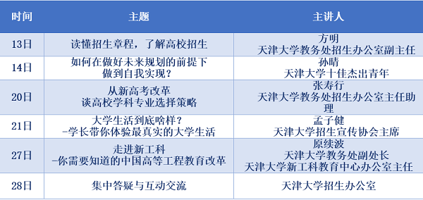 本站讯(通讯员 方明)2020年注定是一个特殊的年份:长时间居家复习的考生热切期盼回归校园;高校特殊类型测试全面推迟;自主招生已成过去式,强基计划将隆重登场;天津考生将迎来全新的高考和志愿填报模式。疫情当前,为更好履行高校社会责任,体现百年学府的使命担当,天津大学招生办公室推出“天大讲堂”系列直播活动,在3月到6月分别以“大学知多少”、“教授讲专业”、“主任面对面”、“天大直通车”为主题开展直播,一起陪同考生及家长度过这个特殊的高考季,助力考生进入理想学府。