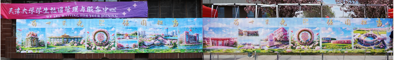 天津大学团委指导,学生社团管理与服务中心专为海棠季打造的“百卅长卷·拼途同行”千人拼图特别活动吸引了众人的注意,这幅需要千人共同完成的大型拼图双校区拼合后总长为13米,寓意庆祝天大130周年校庆。拼图融合卫津路校区东门、北洋纪念亭、郑东图书馆等天大标志性建筑,缀以盛放的海棠花簇与校庆专属标识,经典的标识、超长的画幅、绚丽的色彩让拼图成为了海棠季社团文化节活动现场靓丽的风景线。双校区跨越时空,前任共同完成了这幅拼图。13米拼图长卷恰似天大百卅征程,每一片拼图正如代代学子,以奋斗为经纬,在时光中紧密嵌合,共同拼就民族复兴的壮阔图景——散为星火点点,聚则山河万里。