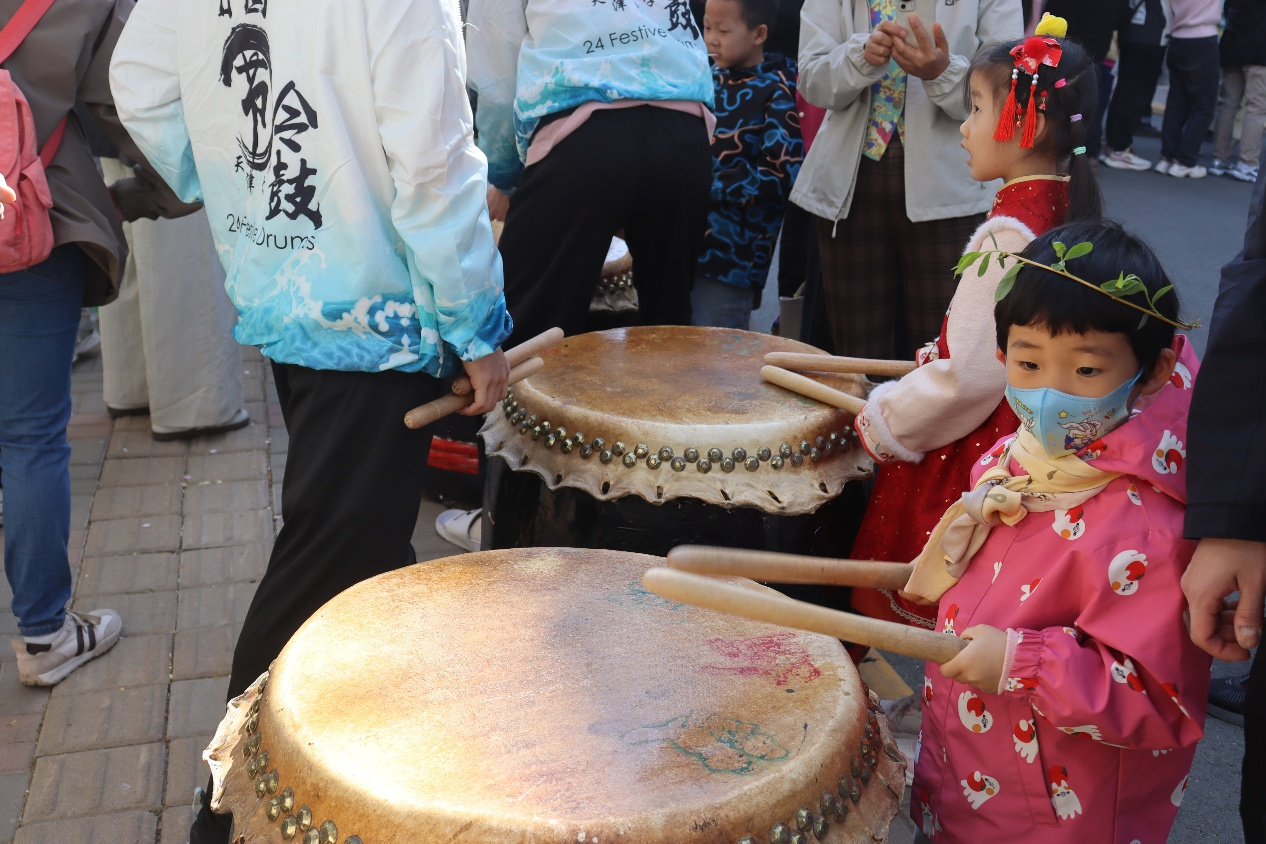 “咚、咚”的鼓声是最好的伴奏,天大廿四节令鼓队社团成员正在耐心地教着小朋友们;北洋工笔重彩协会前围绕着排队等待体验工笔绘画的人们,在绽放的海棠花下,北洋诗词社的易拉宝上写满了大大小小、承载着美好的诗词歌赋。文化气息融入了春日校园,参与者们在创造中感受艺术的魅力与乐趣。