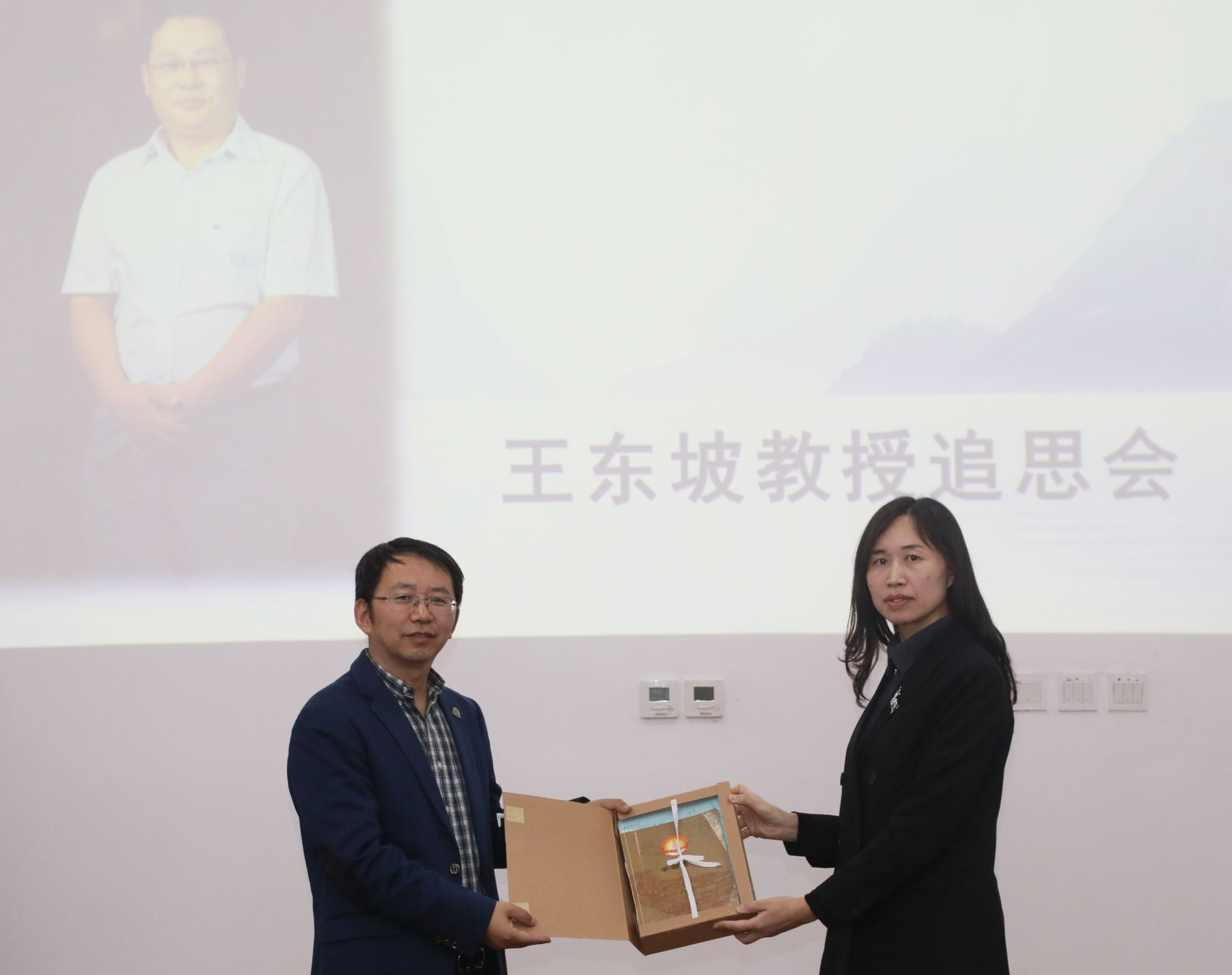 追思会现场,天津大学王学仲艺术研究所所长孙列将历时半年精心创作的中国画《师者 楷模王东坡教授造像》捐赠给材料学院,期冀“实事求是”校风传续绵长。画中,王老师风尘仆仆地从工地赶回实验室投入教学,但仍然激情满满地站在一台实验设备前跟大家聊着科研,旁边是他生前常用的行李箱、计算器……