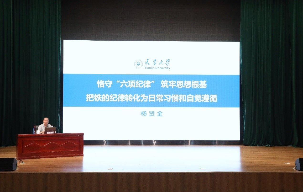 本站讯(记者焦德芳 摄影郭程)6月24日下午,按照学校党委安排部署,校党委书记杨贤金在北洋园校区茅以升厅为全体机关干部讲授纪律党课,党课主题为:恪守“六项纪律”筑牢思想根基 把铁的纪律转化为日常习惯和自觉遵循。校党委副书记韩庆华主持会议。