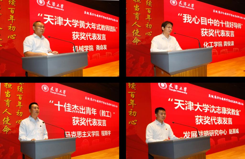 下午2时,大会在雄壮的国歌声中拉开帷幕。全体与会教师共同观看了《天津大学师德公约》宣传视频,也感受了莘莘学子对全体教师的温馨祝福,学习了优秀教师立德树人、爱岗敬业、无私奉献的优秀事迹。会议宣读了表彰决定,受表彰的先进集体和先进个人代表先后上台领奖。机械学院讲席教授尧命发、化工学院英才教授龚俊波、马克思主义学院思政课教师程斯宇和发展战略研究中心管理干部赵熹城等4位代表作了交流发言。