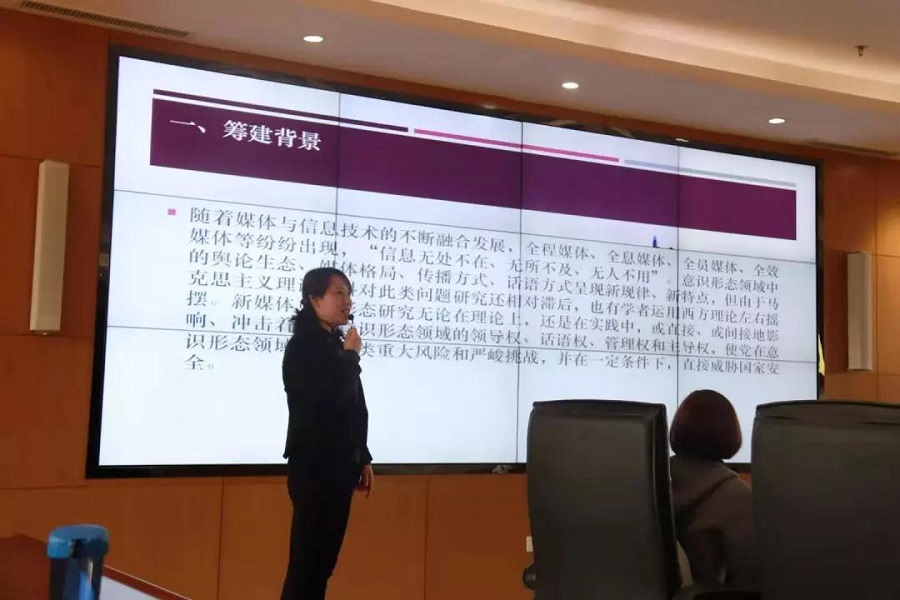 新媒体意识形态研究中心负责人刘娜教授从筹建背景、建设目标、工作机构、机构组成、规划方案、工作机制、工作保障、未来展望等八方面介绍了天津大学新媒体意识形态建设研究中心。中心成立致力于用马克思主义根本立场、观点和方法,创建植根于马克思主义的新媒体意识形态理论,占领学界相关研究理论制高点,实现国内学界理论与实践的思想引领,并为政府、高校开展新媒体意识形态建设,新媒体思想政治教育、教学工作提供积极指导、献计献策。