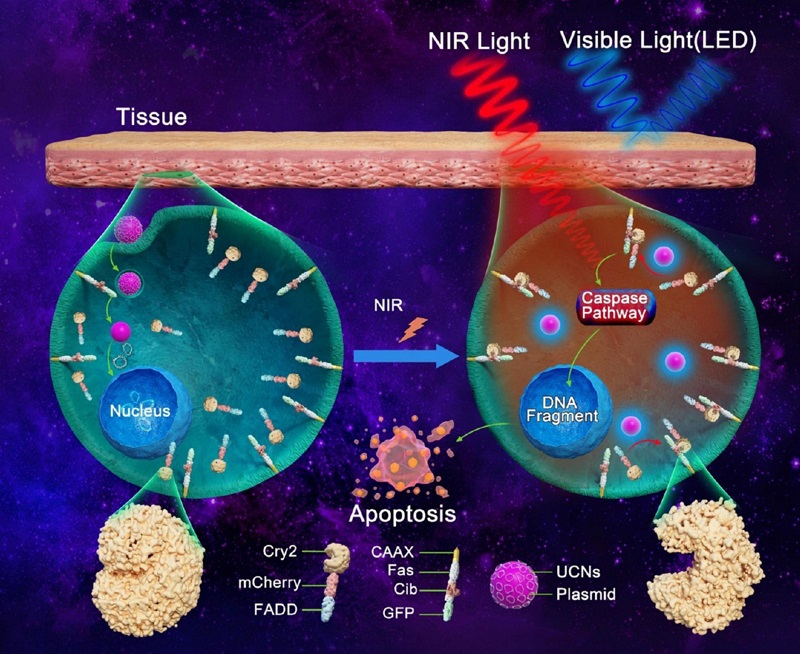 本站讯(记者 赵习钧)天津大学生命科学学院常津教授团队将纳米技术与光遗传学技术结合,设计了一种新型的纳米抗肿瘤光遗传操控系统——研究人员向生物体表面照射脉冲式近红外光,光线穿透深层组织,被稀土纳米颗粒接收转换为可见蓝光,进而激活光感蛋白,最终精准触发肿瘤细胞凋亡。这一系统的成功研发,有望提供一种恶性肿瘤“微创治疗”新方式。介绍该成果的论文《近红外光激活的上转换光遗传学纳米系统用于肿瘤治疗》已发表在纳米领域知名期刊《ACS Nano》上。
