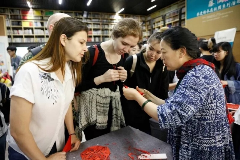 9日下午的“传人·学子”携手非遗活动则趣味十足,热闹非凡。天津大学折纸、剪纸、手工艺、书画等多个社团的学生们,与南通蓝印花布传人吴元新、倪沈键,陕西凤翔泥彩塑传人胡新明、胡锦伟父子,天津杨柳青年画传人霍庆有、王丹,天津魏记风筝传人魏国秋、魏博文父子,浙江刺绣传人金家虹,浙江仙居花灯传人陈彩平,山西剪纸传人郭梅花、王舒琛师徒,以及北京纸塑传人吉胜久,组成搭档,一边交流互动,一边给前来参加活动的观众讲解非遗制作技艺,指导大家亲自动手尝试。整整4个小时的活动,人来人往川流不息,不仅有天津各个高校的学生纷纷赶来,还有不少年青教师带着孩子前来体验,来自各国的留学生们更被中国的非遗迷住,流连忘返。