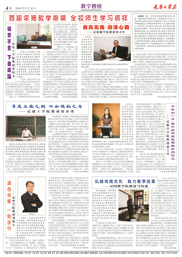 为进一步深化学校教育教学改革,激发一线教师教学热情和活力,提高教学水平和人才培养质量,我校日前与仁爱集团合作,设立了求是教学楷模奖教金。该奖教金每年评审一次,奖励立德树人、关爱学生、投入教学、成果丰硕、学术卓越、业绩突出的优秀教师。今年天大启动了首届求是教学楷模奖教金评选工作,经各学院(部)申报、主管部门审核、本科教学指导委员会评审、党委常委会审议等议程后,最终确定了贾绍义等6位教师为2018年度天津大学求是教学楷模奖教金获奖教师。本版将展示6位教师的先进事迹,希望全校教师以他们为榜样,积极投入教学工作,不断提高教学水平,为建设世界一流本科教育,培养社会主义建设者和接班人作出应有的贡献。