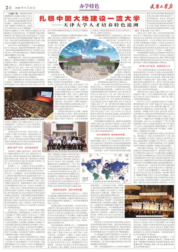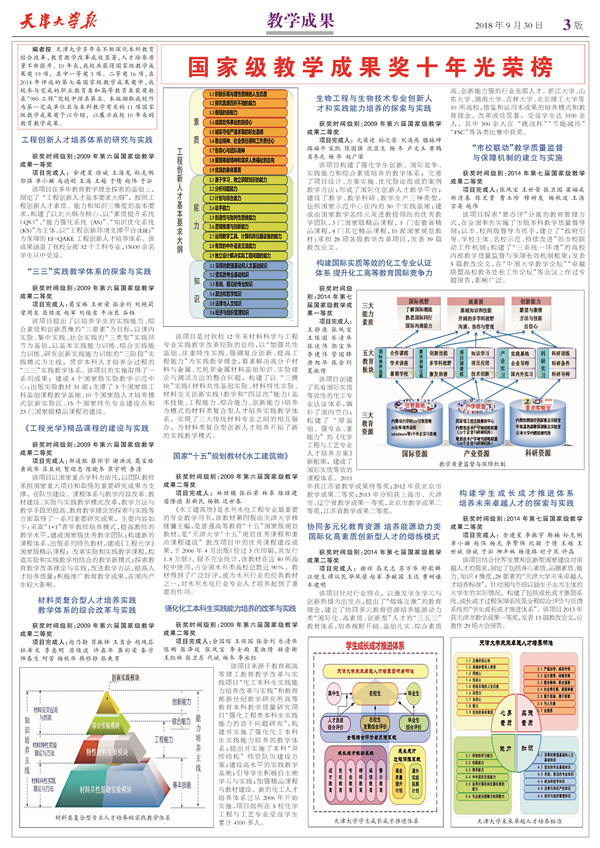 天津大学多年来不断深化本科教育综合改革,教育教学改革成效显著,人才培养质量不断提升。10年来,我校共获得国家级教学成果奖19项,其中一等奖3项、二等奖16项,在2014年评选的第七届国家级教学成果奖中,我校参与完成的职业教育类和高等教育类获奖数在“985工程”院校中排名第五。本版撷取我校作为第一完成单位且与本科教学有关的11项国家级教学成果奖予以介绍,以展示我校10年来的教育教学成果。