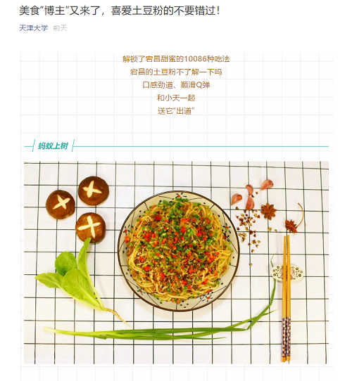 不仅如此,老师们还自发为扶贫好物代言,助力宕昌县农产品销售。为了呈现出“带货”照片的最佳效果,馆员老师们专门购买精致的餐具、精心研制色香味俱全的菜品,力求精益求精,全面展示扶贫产品的品质。图书馆邓泽宇老师用宕昌县生产的土豆粉制作的“蚂蚁上树”还在学校官方微信推送中展示,得到广泛好评。