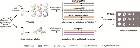 图1.SCRaMbLE进化和快速适应性进化示意图