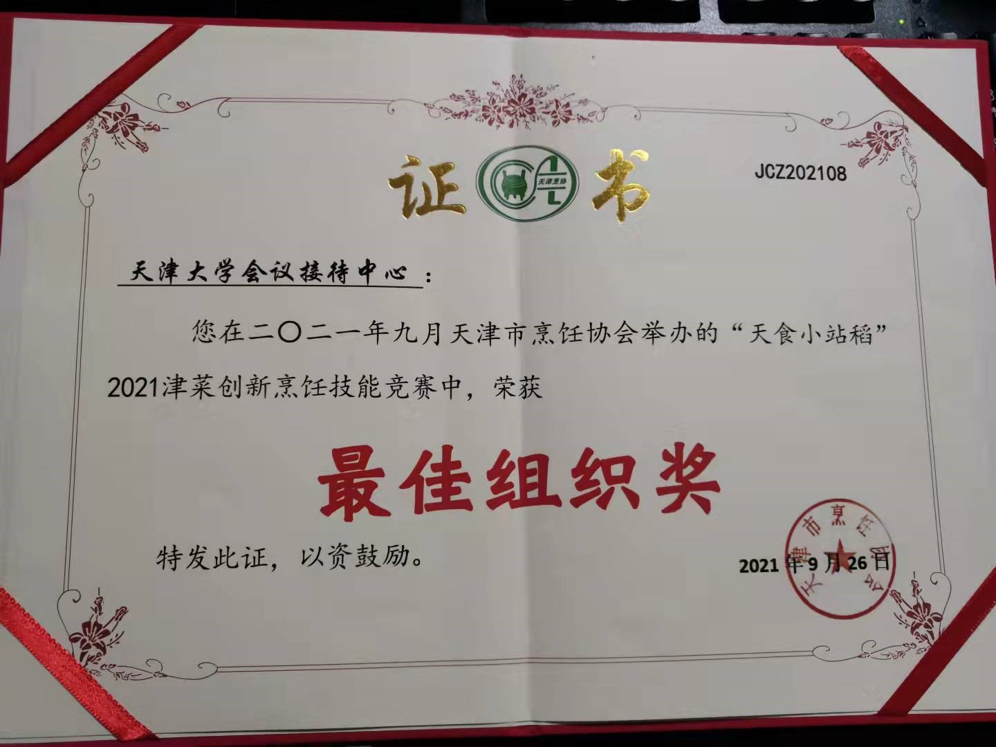 天津大学会议接待中心继两周前“中华美食荟”上勇夺餐饮两项大奖后,此次再创佳绩,参赛代表——天津大学会议接待中心餐厅出品总监崔跃、厨师长赵建昌凭借扎实的理论基础、精湛的烹饪技法、创新的菜肴出品、新颖的装碟摆盘突出展示了有天津大学人文情怀的作品,并分别荣获了特金奖和金奖以及集体的最佳组织奖,另外崔跃还在后续的“2021年全国行业职业技能竞赛——全国餐饮行业职业技能竞赛”中荣获中式烹调金奖。另外值得一提的是中心选派了两名工作人员协助主办方天津烹饪协会出色地完成了会务组的接待工作,得到了协会及同行们的高度赞扬。