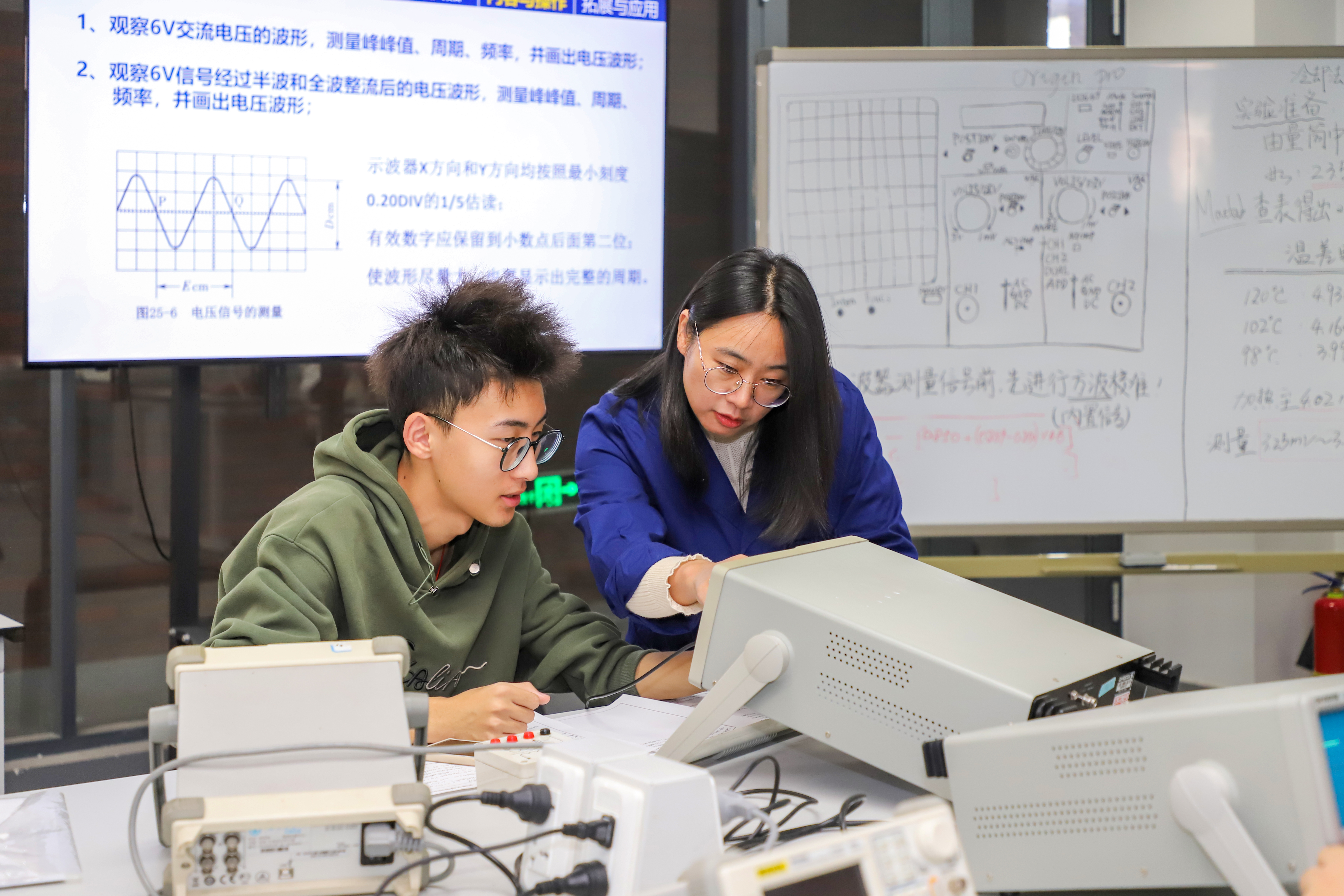刘京津(右)指导本科学生操作示波器