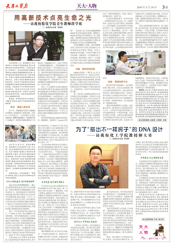三版:“天大·人物”:访我校精仪学院教师段学欣、化工学院教师仰大勇