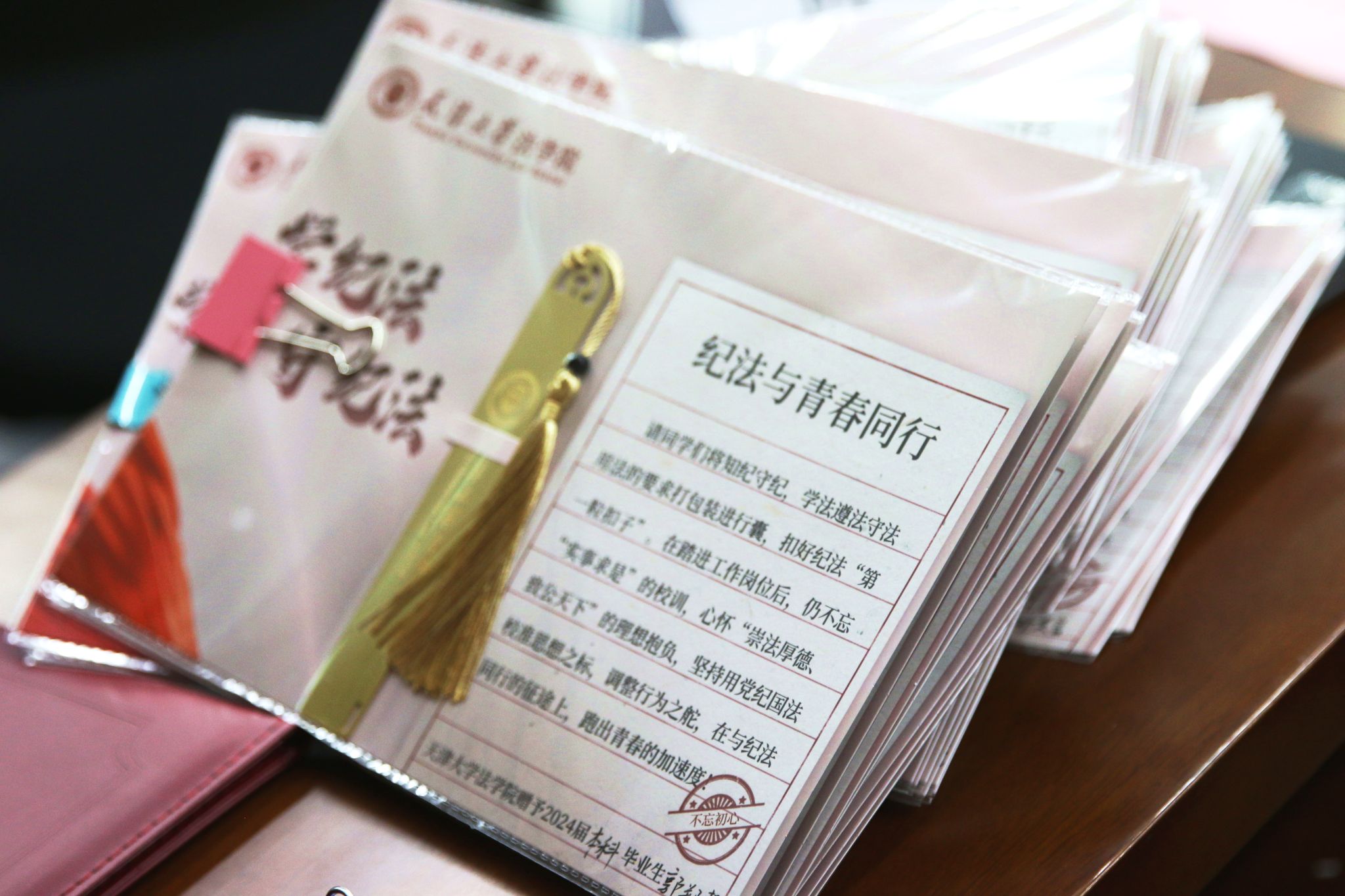 临别之际,为毕业生赠送各具特色的毕业礼物是天津大学的传统。法学院外,自动化学院为毕业生准备了写满四年课程的文件袋等作为伴手礼,寓意“知识累积与传承”;精仪学院为2024届本科毕业生定制了木质黄铜签字笔及“一路前行”定制书签尺作为伴手礼,希望同学们谨记“实事求是、精益求精”的为人治学准则;建筑工程学院则为毕业生准备了扉页印有“移山填海,建功立业”口号以及师长们毕业寄语的文创本作为伴手礼;经管学部组织毕业生簪花装饰学士帽,寓意毕业生未来“一路生花”……