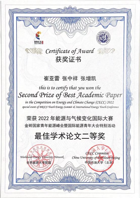 本站讯(马寅初经济学院供稿)由世界能源大学联盟和中国石油大学(北京)主办的2022年能源与气候变化国际大赛于2022年9月18日在北京落下帷幕。经过初赛和决赛,天津大学马寅初经济学院创院院长、卓越教授张中祥指导的博士研究生崔亚蕾的论文“Unequal age-based household carbonfootprintin China”荣获2022年能源与气候变化国际大赛——金砖国家青年能源峰会暨国际能源青年大会特别活动最佳学术论文二等奖。