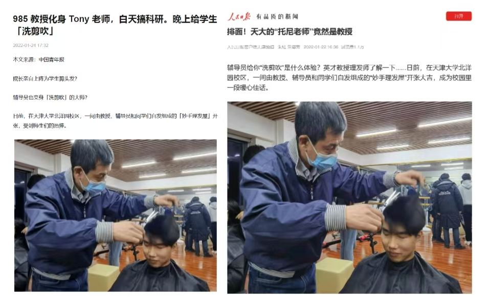 2022年,一篇《985教授化身Tony老师,白天搞科研、晚上给学生“洗剪吹”》的推文火爆全网。其中的“Tony老师”就是曹树谦教授。原来,受疫情影响,学校实行了较长时间的封闭管理,同学们理发成了“头”等大事。为了解决这个难题,包括曹树谦老师在内有理发经验的师生就自发组成了义务理发队,为同学们理发。