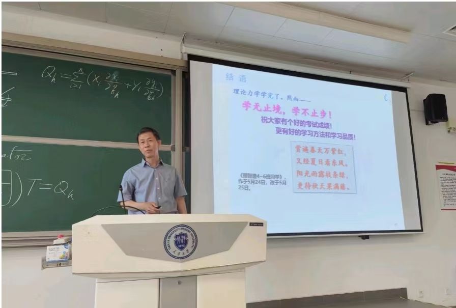 《理论力学》是一门全校公共基础课,也是每年千余名学生的必修课。学生们都知道,曹老师的课有三个固定环节:上课前有“课首语”,下课前有“小补充”,授课过程中还有“闲言碎语”。这些形式和方法是曹树谦开展课程思政的“独门秘诀”,也是他已经坚持了20多年的习惯。
