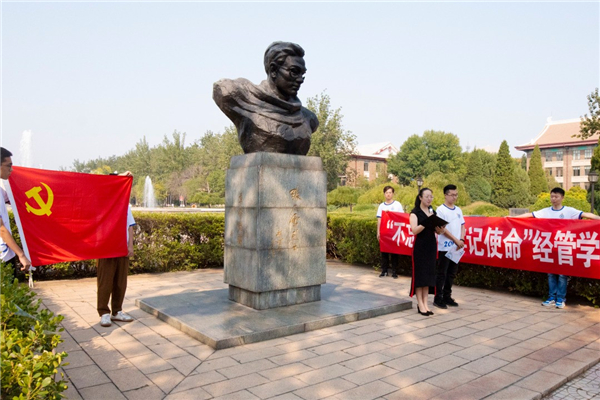 现场教学结束后,学部党委中心组、师生党员共聚太雷像前,向张太雷烈士致敬。本科生田烁朗诵原创作品《太雷颂》。“太雷精神今犹在,当年北洋新气象”,在她声情并茂地朗诵中,党员同志们更加深刻地感受到身上责任之重,吾辈应担当起革命重任,传扬爱国奉献精神。朗诵结束后,由学生代表为张太雷烈士献花,全体师生向张太雷烈士像三鞠躬,以最崇高的敬意祭奠为国捐躯的革命先烈,表达对烈士无限的哀思和崇敬。最后,管理与经济学部党委书记马寿峰同志带领全体师生党员代表重温入党誓词,一句句铿锵有力的誓言让大家再次深深地感受到了身为党员的责任、使命和荣耀。