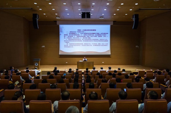 本站讯(记者 朱宝琳 摄影 丁宇)9月16日,天津大学举办“不忘初心、牢记使命”主题教育理论辅导报告会,由吉林大学党委宣传部部长、马克思主义学院教授韩喜平带来题为“以理论之光照亮中华民族复兴之路”的理论辅导报告。校领导班子成员、中层干部和教工党支部书记等近400人聆听了报告。