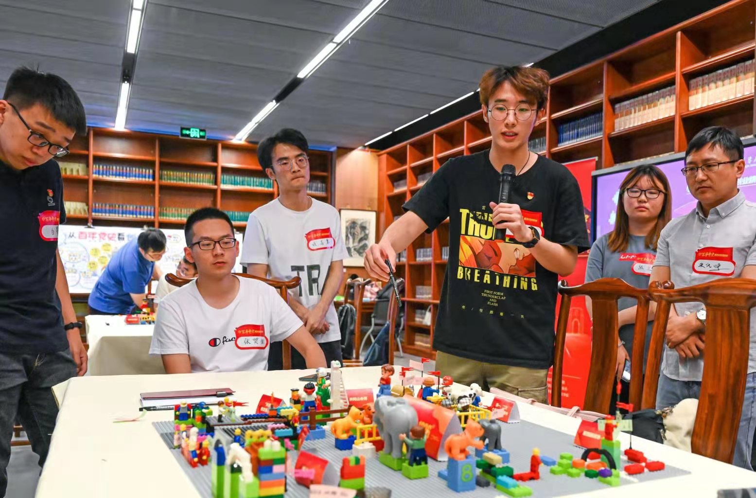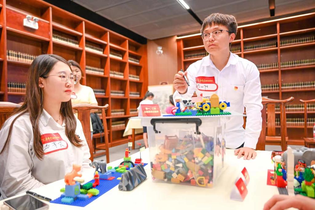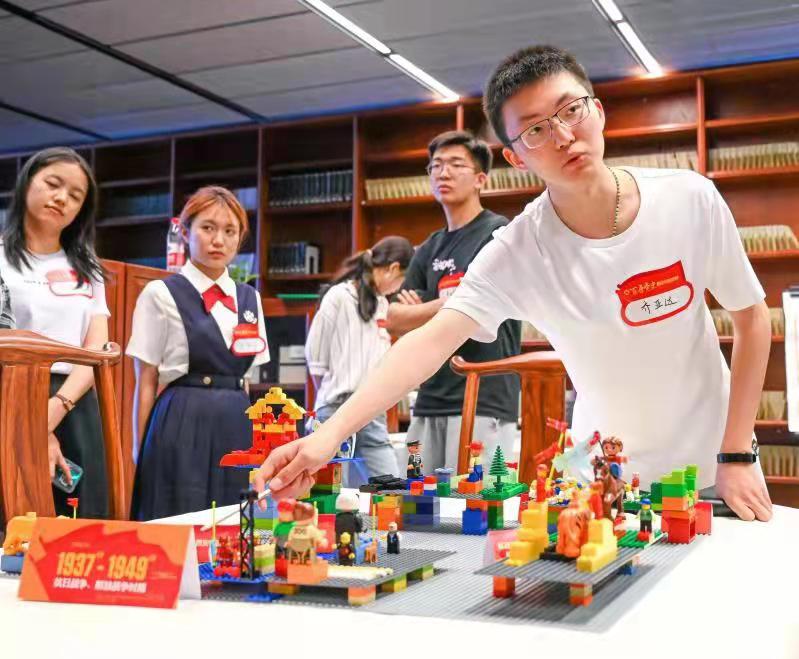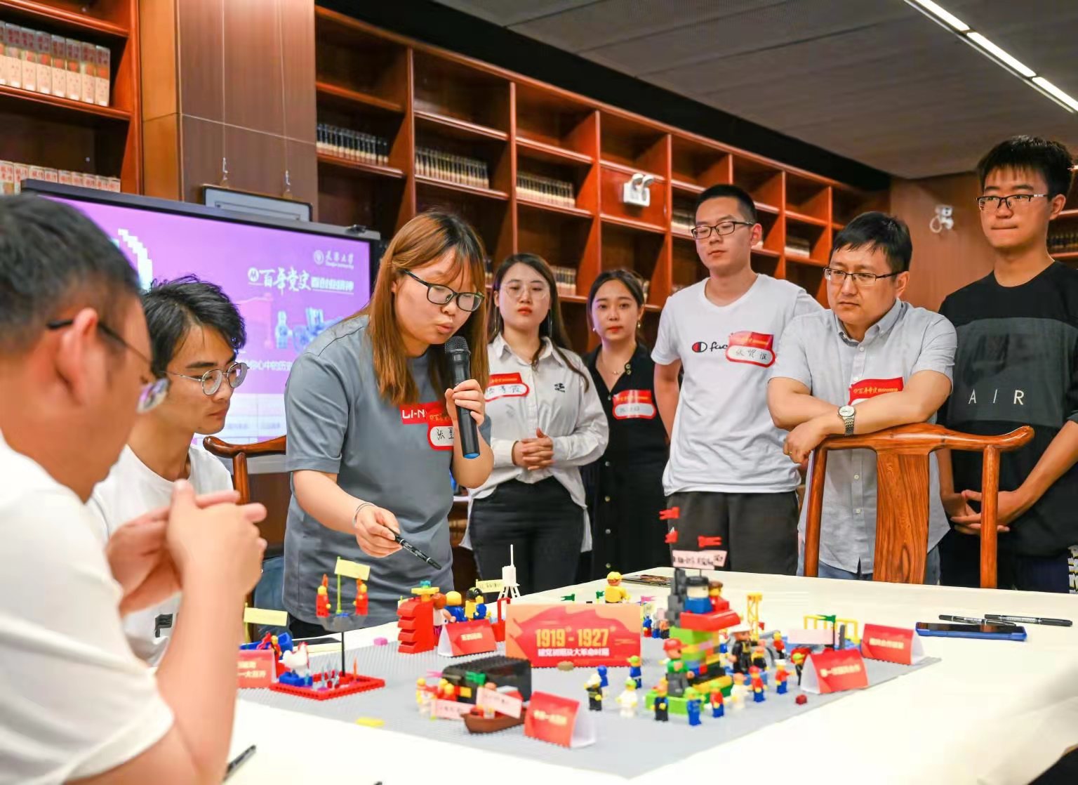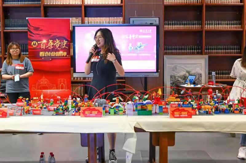 本站讯(记者刘晓艳 图李天宇)面对一堆乐高零件,你能用它们搭建一座“你心中的党员精神之塔”吗?2021年6月19日下午,在天津大学图书馆日新书斋,30名大学生从这个问题开启了一场奇妙的党史学习之旅。在接下来将近4个小时的时间中,他们用乐高零件搭建起一个个场景:中共一大、国共第一次合作、南昌起义、长征、开国大典、改革开放、十九大……当所有的场景搭建完成,每位同学都会对自己所搭建的场景讲一个生动的党史故事,而最终所有的场景用红色的“血脉”线连在一起,便鲜明地形成了共产党人在百年征程中形成的精神谱系。