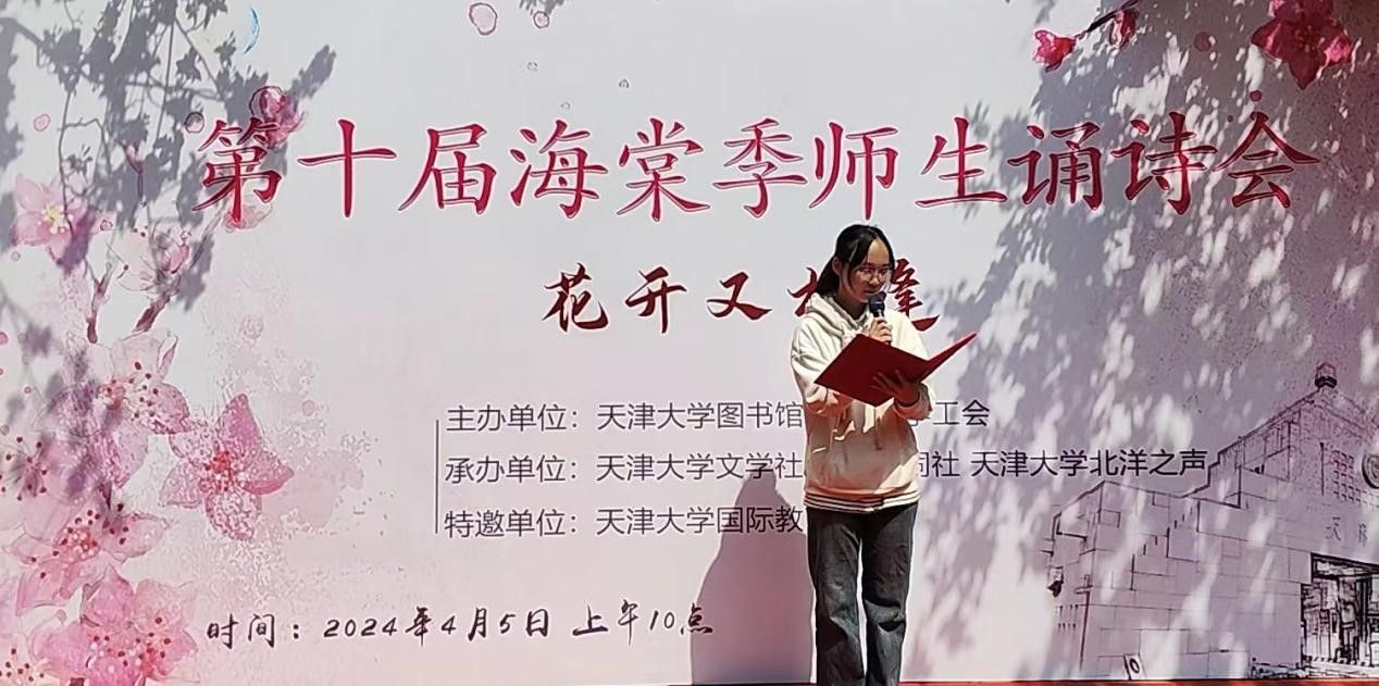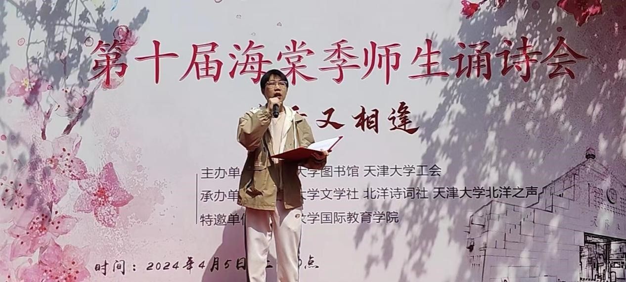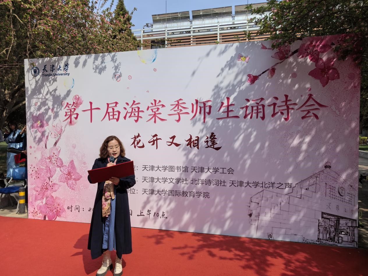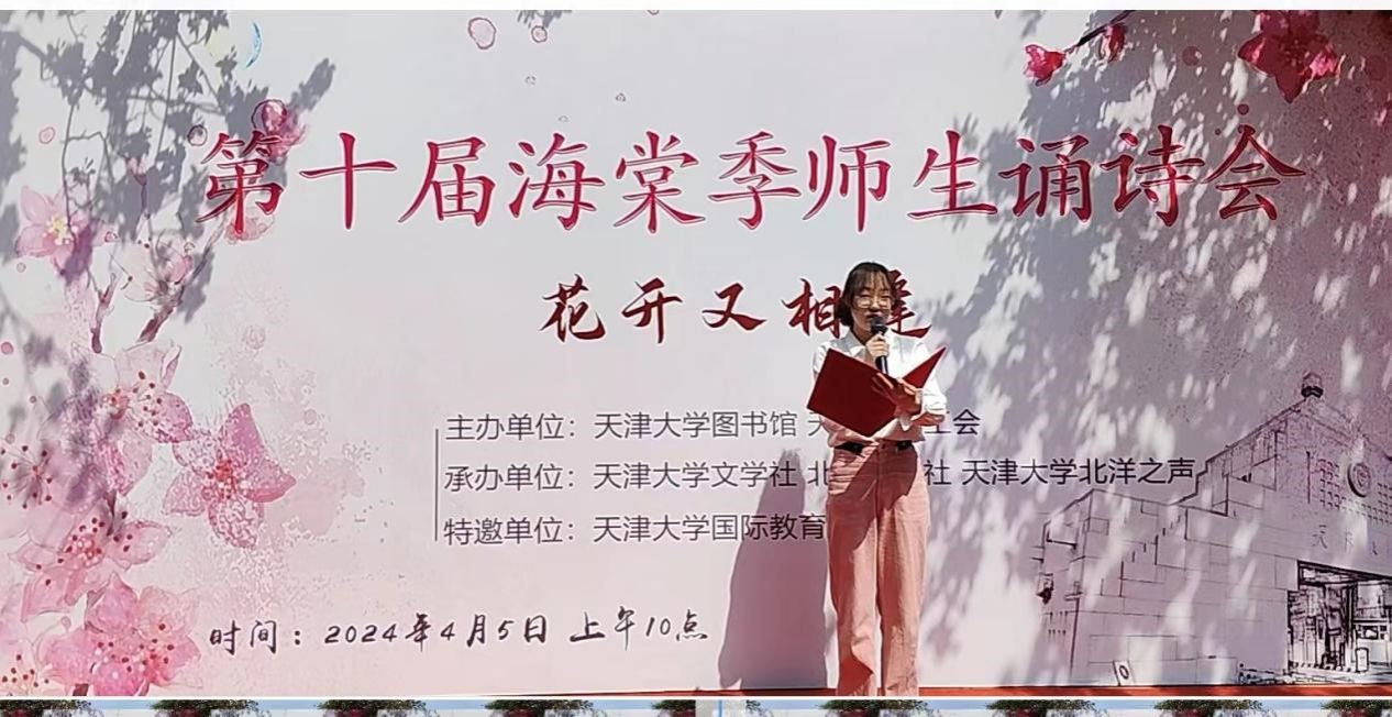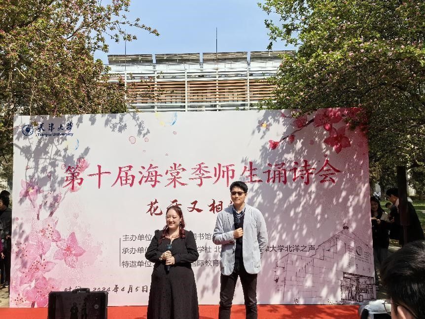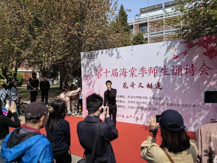 本站讯(通讯员 钱欣瑞)“等闲识得东风面,万紫千红总是春”。为增进学校师生情谊,增强文化自信,4月5日上午,由天津大学图书馆、天津大学工会主办,天津大学文学社、北洋诗词社、天津大学北洋之声协办的第十届海棠季诵诗会在卫津路校区铭德道成功举办。活动特别邀请到国际教育学院师生代表共襄盛举。天津大学图书馆的钱欣瑞老师主持了此次诵诗会。