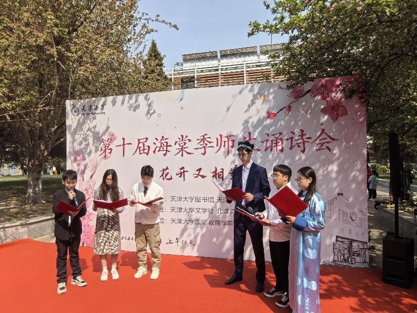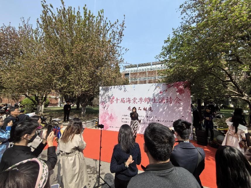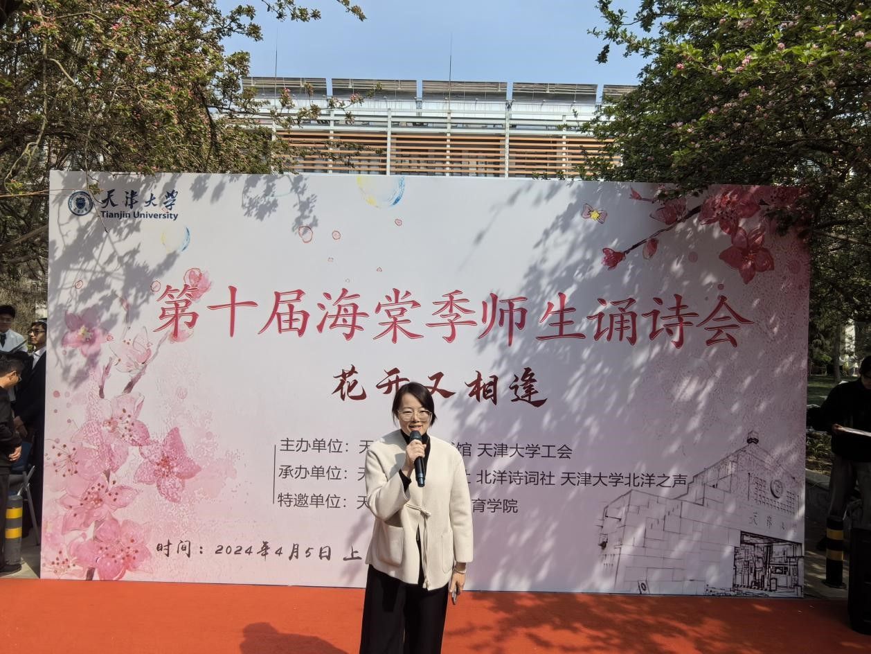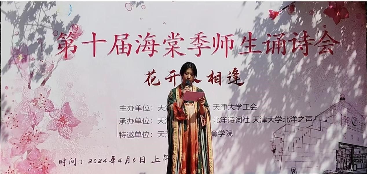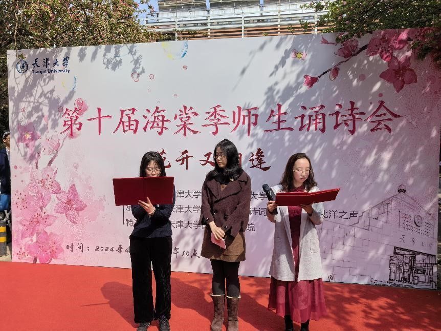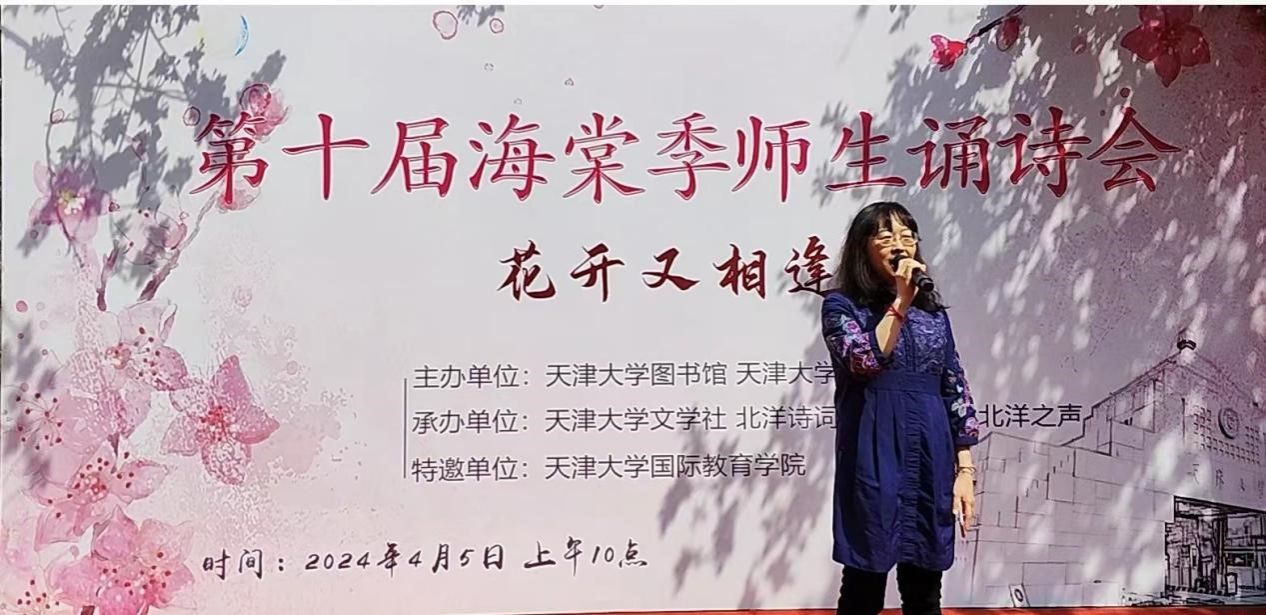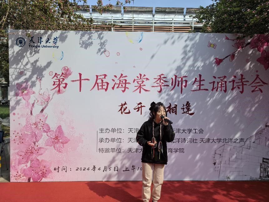 本站讯(通讯员 钱欣瑞)“等闲识得东风面,万紫千红总是春”。为增进学校师生情谊,增强文化自信,4月5日上午,由天津大学图书馆、天津大学工会主办,天津大学文学社、北洋诗词社、天津大学北洋之声协办的第十届海棠季诵诗会在卫津路校区铭德道成功举办。活动特别邀请到国际教育学院师生代表共襄盛举。天津大学图书馆的钱欣瑞老师主持了此次诵诗会。