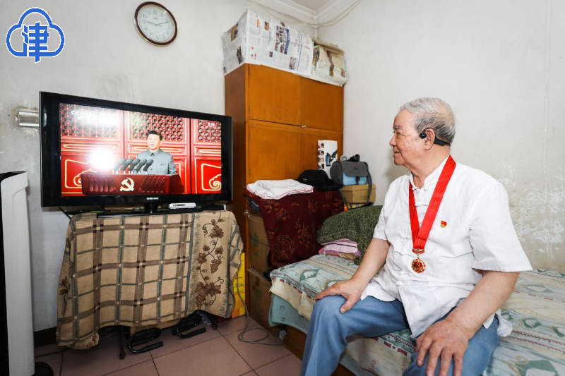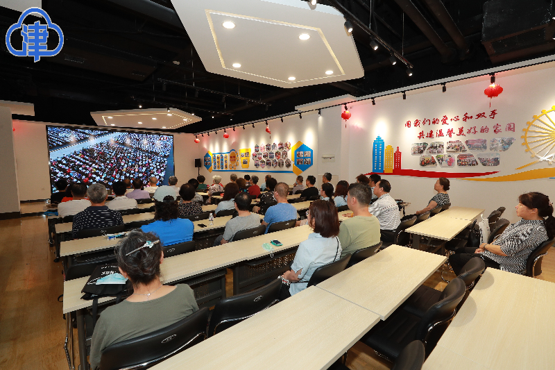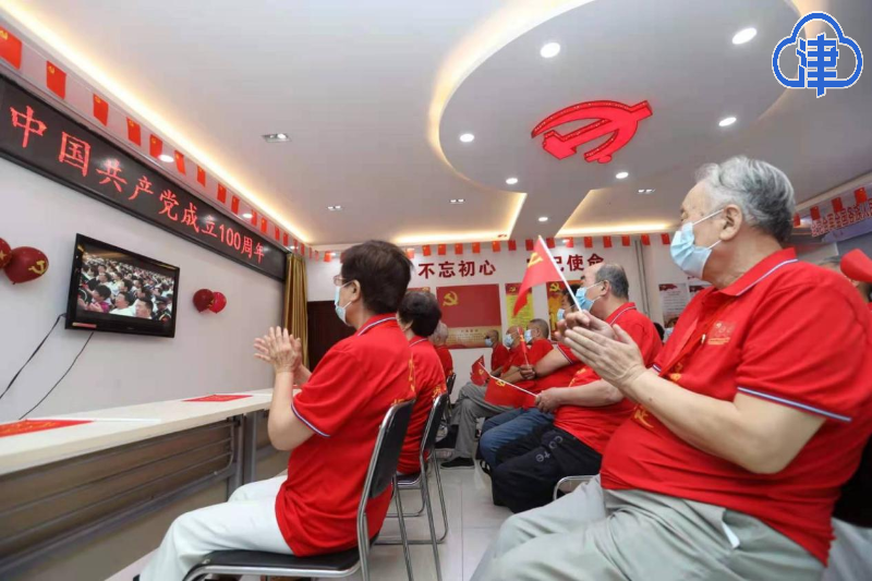 7月1日一早,在南开区昔阳里社区,街道干部、居委会党员社工以及20名在党50年以上的老党员集中收看了庆祝中国共产党成立一百周年大会的现场直播。