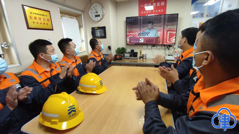 天津港轮驳公司员工在拖轮上收看庆祝中国共产党成立100周年大会
