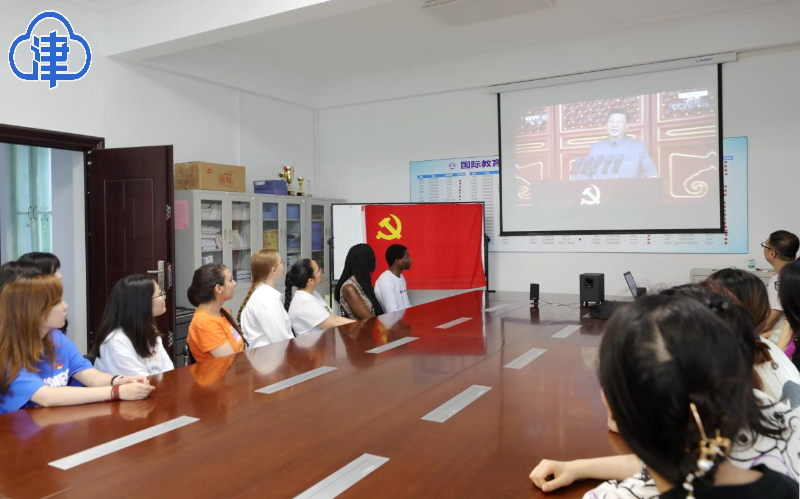 天津外国语大学全体校领导、中层以上干部集体观看大会直播盛况。各二级党组织分别组织党员干部师生,及留学生代表收听收看庆祝大会。