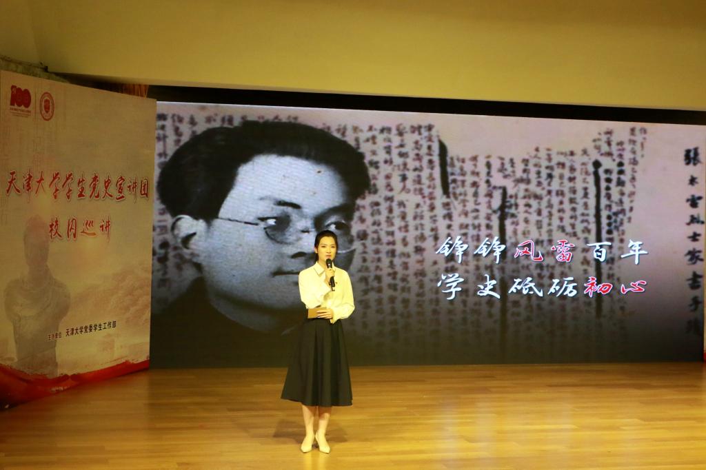 青年节前夕,一场名为“铮铮风雷百年,学史砥砺初心”的主题宣讲引发天大师生观者如潮。这是天津大学学生党史宣讲团的一场宣讲:北洋大学校友、革命先烈张太雷被“请”上舞台,与现场观众展开一场感人的“时空对话”。宣讲团以详实的史料和青年人的视角,与北洋话剧团一同精彩演绎,深情再现了张太雷烈士短暂而光辉的一生,解读他为人民“谋将来永远幸福”的初心使命。天津大学学生党史宣讲团团长、经管学部本科生田烁说:“我们希望通过这种创新形式的党史学习教育,引导同学们思考如何树立与时代主题同心同向的理想信念,如何把个人发展融入国家发展中,把青春梦融入强国梦,用实际行动为建党100周年献礼。”