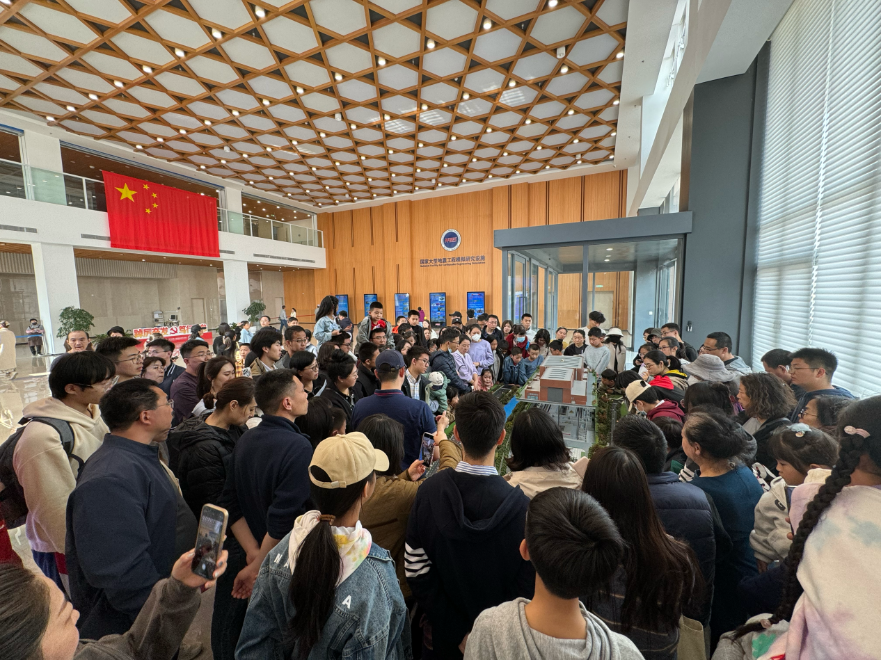 伴随着两扇24米高的大门缓缓打开,映入眼帘的是国家大型地震工程模拟研究设施实验中心的内部场景,游客们纷纷举起手机,记录下这个瞬间。作为天津市首个国家重大科技基础设施,国家大型地震工程模拟研究设施肩负着解决国家重大科技问题的责任与使命。“我们的大型振动台台面长20m,宽16m,可载重1350吨……”,地震大装置的老师向游客们详细介绍设施建设情况,揭示地震大装置的奥秘。“看,这就是我们国家的大国重器”游客们听得津津有味,纷纷交流互动。