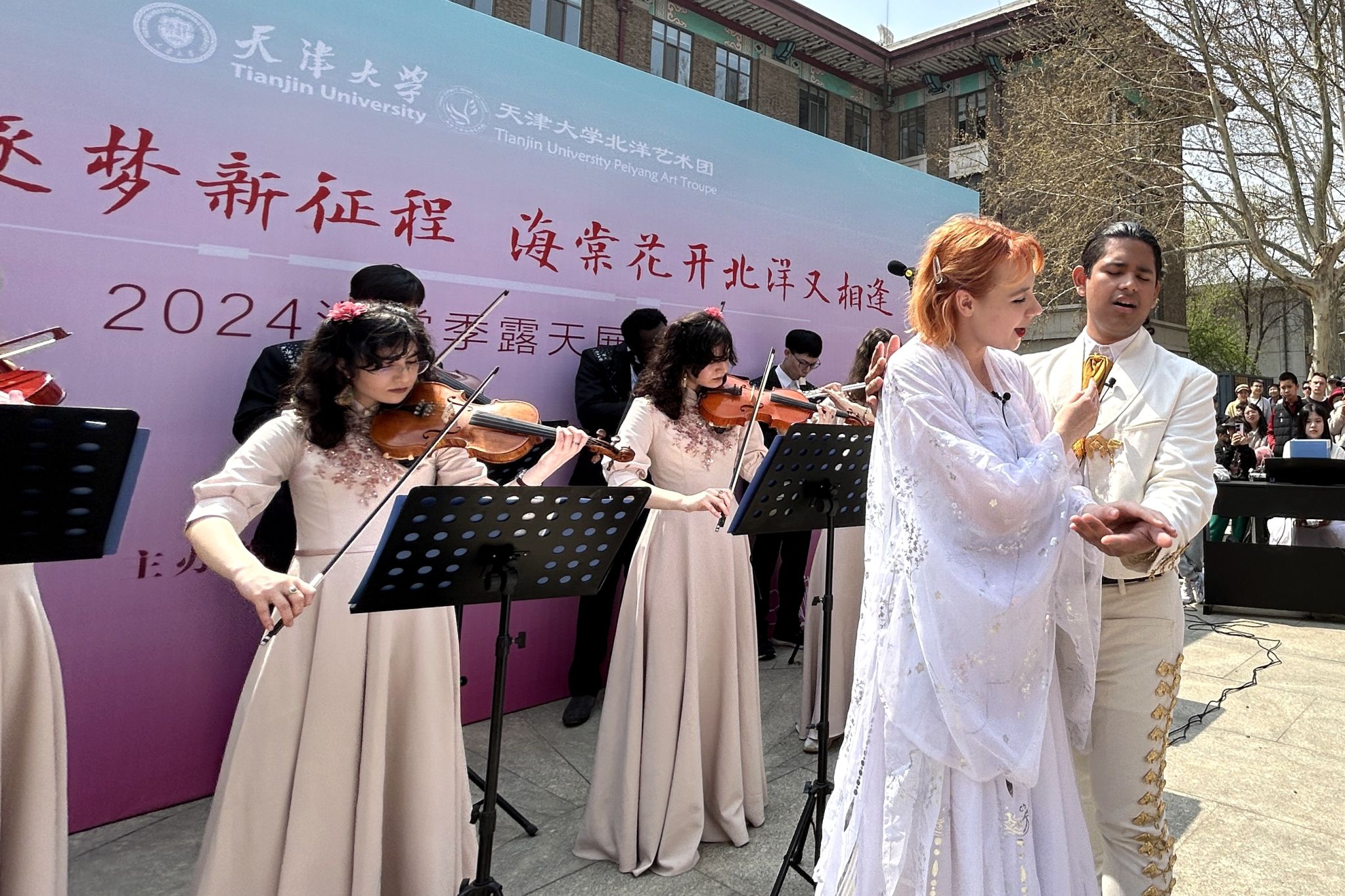4月5日上午,铭德道北侧迎来了一场音乐盛宴——国际中文合唱团海棠季路演。演出以多样的曲目和精湛的表演,深深打动了在场观众。