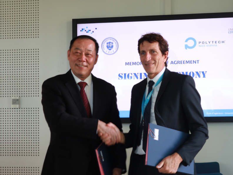 访问尼斯综合理工学院期间,该校校长Alexandre Camonada与代表团会谈会见。Camonada校长对杨贤金到访表示热烈欢迎,希望继续推进两校学生、教师和行政管理人员的交流交换,深化与蔚蓝海岸大学在多学科的交流合作,促进天津大学与法国综合理工联盟的合作。杨贤金对尼斯综合理工支持国际工程师学院再次通过CTI认证表示感谢,强调跨文化的理解力对学生发展的重要性,希望双方深入推进双硕士项目,培养具有全球胜任力的学生。双方就法国工程师教育培养方案与特色,以及与中国研究生教育改革情况进行了深入的讨论。会谈期间,Camonada校长与杨贤金书记签署了合作协议。随后,杨贤金看望了在尼斯综合理工就读的我校学生。