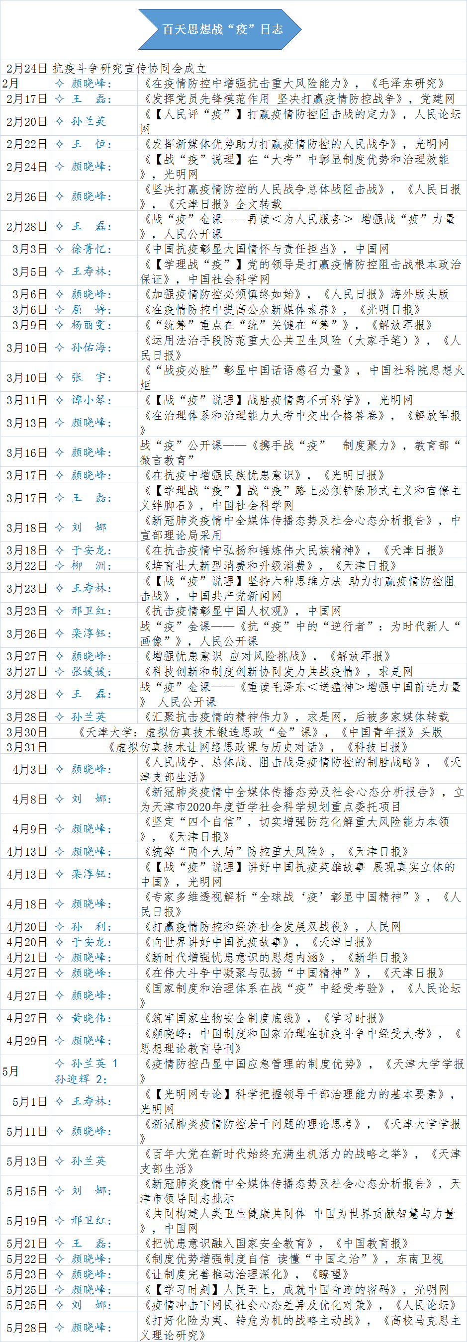 本站讯(通讯员 寇文静)疫情防控阻击战打响不久,在天大党委的领导下,马克思主义学院院长颜晓峰教授作为负责人,依托天津市中国特色社会主义理论体系研究中心天大基地成立了“抗疫斗争研究宣传协同会”。协同会共有研究人员60余人,以马克思主义学院教师为主体,同时集聚了法学院、天津大学生物安全战略研究中心、APEC可持续能源中心、天津大学新媒体意识形态建设研究中心、宣传部、人文社科处等相关单位和部门的研究力量,聚焦疫情防控相关问题进行研究,以思想战“疫”,释疑解惑,引领舆论方向,咨政育人。近百天以来,协同会成员在《人民日报》《光明日报》《解放军报》,人民网、光明网、求是网等中央和地方媒体发表理论宣传文章41篇,在《思想理论教育导刊》《天津大学学报》等期刊发表学术论文9篇,向上级有关部门提交智库报告4篇,为教育部、天津市委理论学习中心组、人民网、东南卫视等做理论报告或者讲授抗疫“金”课,展现天大人的理论研究初心与社会服务担当。