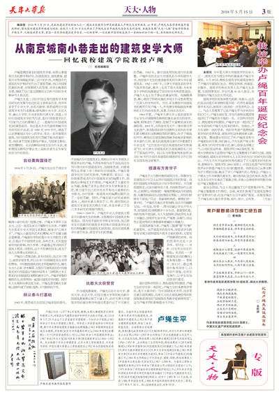 2018年3月29日,是我校建筑学院创始人之一、建筑历史教学与研究的奠基人卢绳先生百年诞辰。41年前,卢绳先生在学者的盛年遽然辞世,深为国内建筑界所痛惜与惋怀。我校于3月29日当天举办了卢绳先生百年诞辰纪念会及系列活动。本报在本期“天大·人物”专版中特推出卢绳生平、人物通讯等文章,重温一名优秀的建筑史学专家、一位好老师、一位承载中国传统美德于一身的知识分子的一生,共同缅怀大师风范。