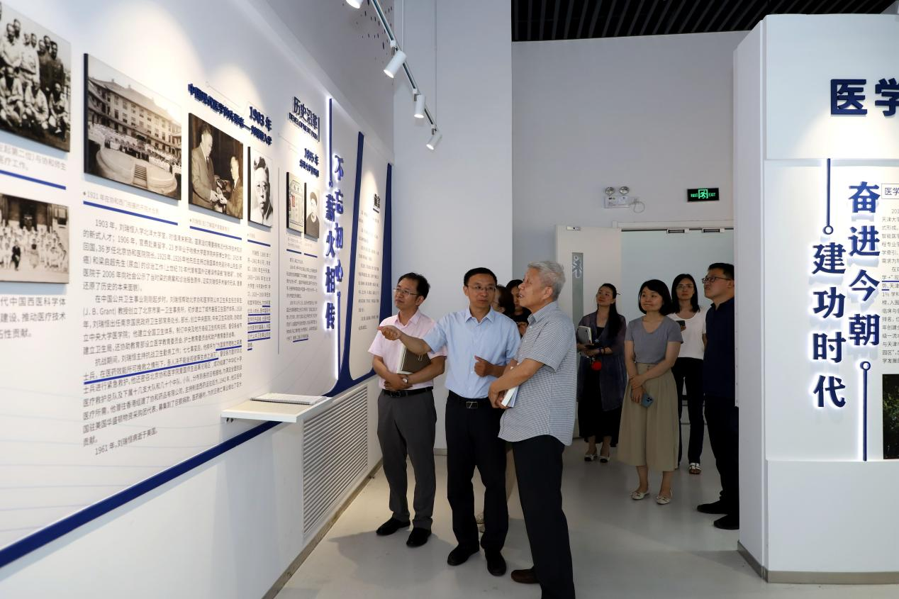 在医学院院史馆,医学院党委书记李振宇、副院长万亮,向专家组做现场参观讲解,并汇报了院史馆的建设和使用情况。医学院院史馆建设旨在多维度、多层次地展现天大发展史上的兴医脉络及医学院在教学、科研、文化等方面发展成就,打造培育师生文化自信的重要载体及社会各界人士认识天大医学、了解天大医学的重要窗口。主展馆天津大学“兴医之路”主题教育馆包括七大部分,以内容丰富的展板+实物展品+数字化技术相结合的方式打造沉浸互动式学院展厅。外围展示区中,一层大厅区域用于展示医学精神以及学生对于医学的理解、医学生精神风貌、医学院教学成果等内容,中心走廊区域用于展示医学的整体历史发展脉络以及智能医学的内涵。