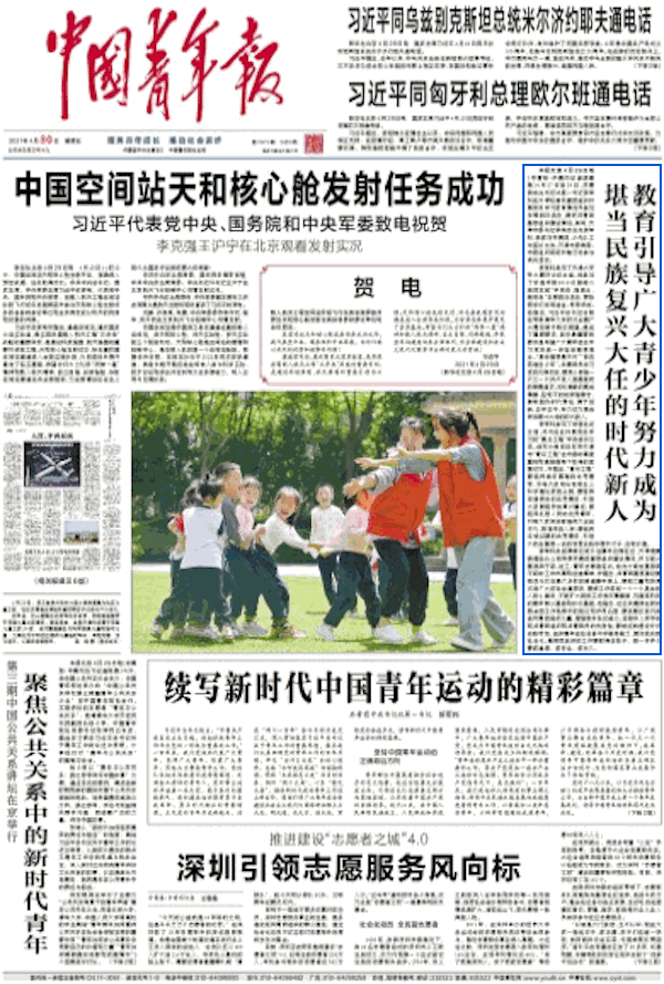 中国青年报:http://zqb.cyol.com/html/2021-04/30/nw.D110000zgqnb_20210430_4-01.htm
