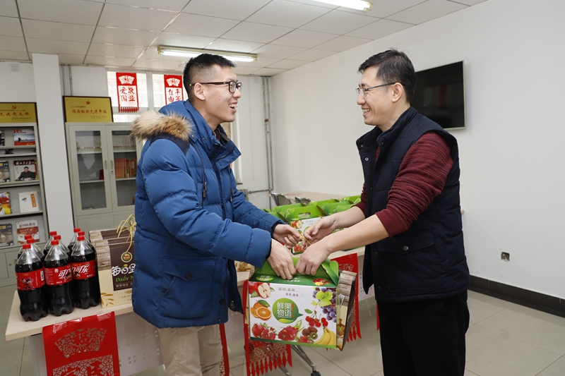 为了方便学生领取,发放活动直接安排在宿舍区进行,今年的“年货大礼包”有火龙果、猕猴桃、橙子、苹果等水果,还有开心果、巴旦木、花生等各类干果以及饮料。临近中午,学生们有序地排队登记领取,抱着沉甸甸的大礼包露出笑容。