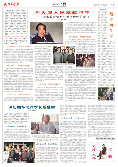 我校杰出校友聂璧初同志4月20日逝世,享年90岁。他那亲切的笑容仿佛历历在目,那洪亮的声音好像就在耳畔响起…….聂璧初校友1946年考入北洋大学机械系,1950年毕业后留校任校党总支书记。他一生秉承母校“实事求是”的校训,为新中国的解放事业和天津市的发展作出了重要贡献。他生前热爱母校,关心支持母校事业发展,数十年来积极组织参与北洋大学校友“西沽同窗联谊活动”,支持成立天津校友会……本报本期“天大·人物”专版特刊发纪念聂老的文章,讲述他生前的故事,让我们后辈永远记住“北洋-天大人”浓重深厚的“家国情怀”,激励大家为实现中华民族伟大复兴的“中国梦”而努力奋斗。
