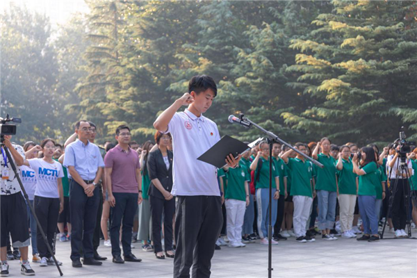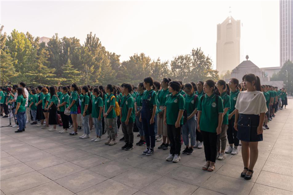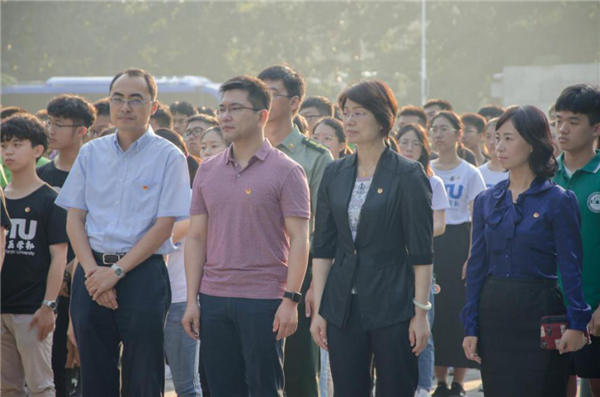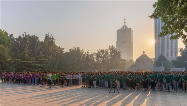 本站讯(通讯员 解雯超)金秋九月,巍巍学府天津大学迎来了2019级新生。9月2日早上,为迎接新中国成立70周年,抒发对伟大祖国的崇敬和热爱,天津大学党委副书记雷鸣、学工部部长赵欣、校团委书记吕静、第二十三届中国青年五四奖章获得者、自动化学院教授齐俊桐以及来自各学院的辅导员老师们和2019级部分本科新生在卫津路校区北洋广场共同举行了一场“我与祖国共奋进”的特别团日活动。
