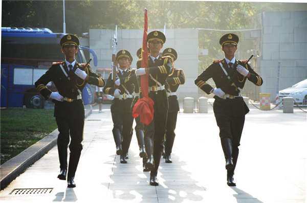 升旗仪式第一项议程---升国旗,奏唱中华人民共和国国歌。伴随着国旗护卫队铿锵统一的步伐和整齐划一的动作,鲜艳的五星红旗缓缓升入空中,迎风飘扬。