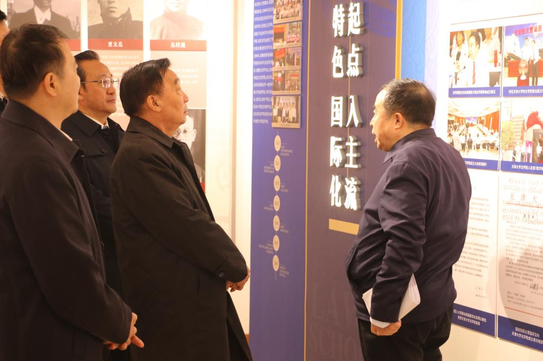 王晨一行首先参观了天津大学法学院院史馆,了解学院的发展情况。孙佑海院长介绍了天津大学法学学科的创建历史、发展历程、学科建设、人才培养、科学研究、社会服务等情况。王晨听取讲解,观看了解天津大学法学院的办学成果。