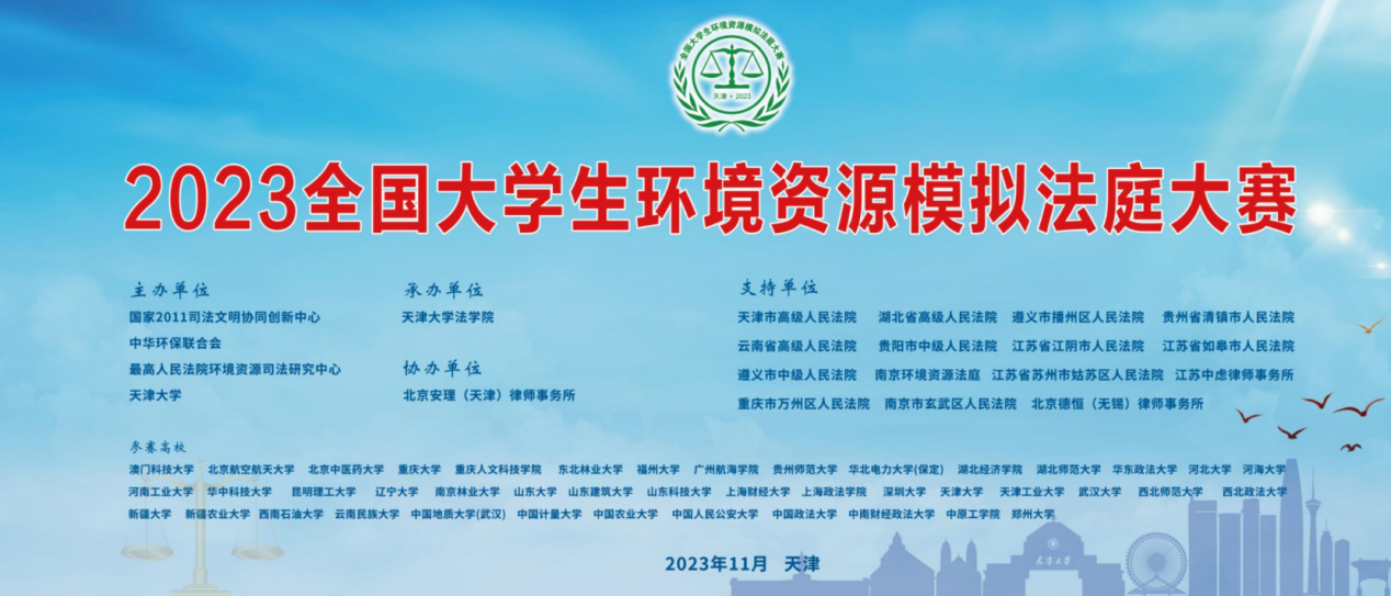 据悉,2023全国大学生环境资源模拟法庭大赛由国家“2011计划”司法文明协同创新中心、中华环保联合会、最高人民法院环境资源司法研究中心、天津大学主办,天津大学法学院承办,北京安理(天津)律师事务所协办。赛事得到了天津市高级人民法院、湖北省高级人民法院、云南省高级人民法院、贵阳市中级人民法院、遵义市中级人民法院、南京环境资源法庭、重庆市万州区人民法院、南京市玄武区人民法院、遵义市播州区人民法院、贵州省清镇市人民法院、江苏省江阴市人民法院、江苏省如皋市人民法院、江苏省苏州市姑苏区人民法院、江苏中虑律师事务所、北京德恒(无锡)律师事务所的有力支持。