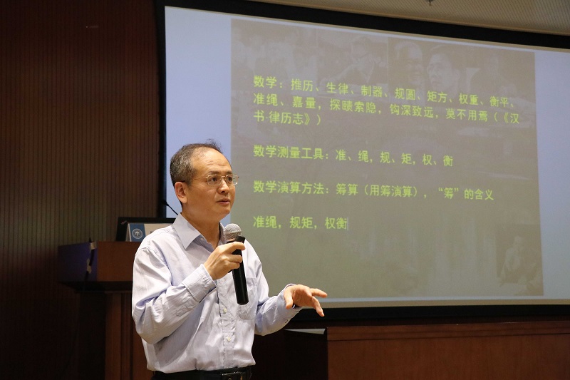 结束对复数“前世今生”的解读,周向宇从数的概念的演化、中国古代数学的贡献、筹算与国学的交融等角度,为听者打开了另一扇玄妙的大门。几千年前的十进位制、以筹计数、数学的用法和测量工具,在周向宇的通俗易懂的语言中生动立体起来。他引用大量包含“筹”“绳”等字的成语或古语,分享了从数学视角领悟中国文化、中国语言的独到见解,阐释了中国文化一贯以来对数学严谨、严格、严密、准确、精确的尊崇,对数学思想、方法、能力的看重,引发了在场师生对中国传统思想中所蕴含学术元素的浓厚兴趣。
