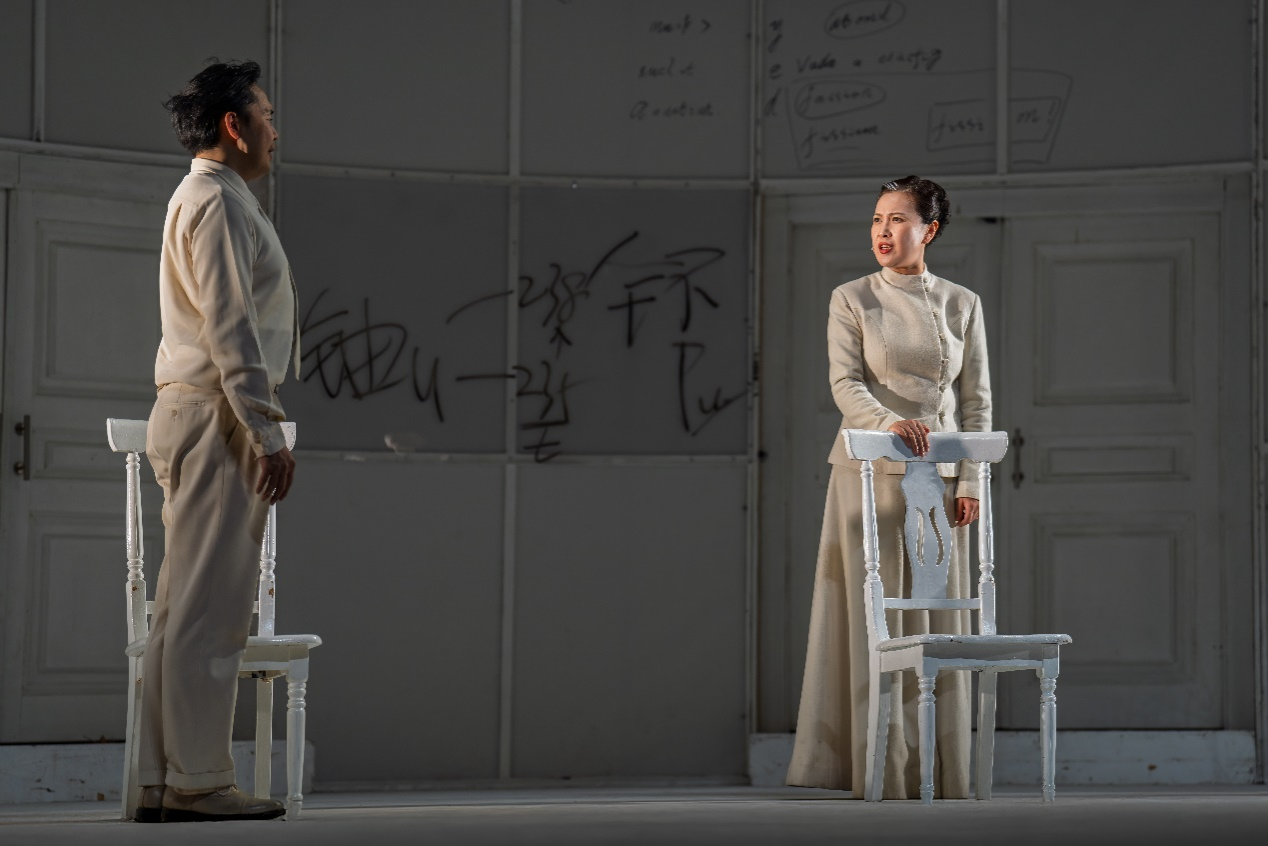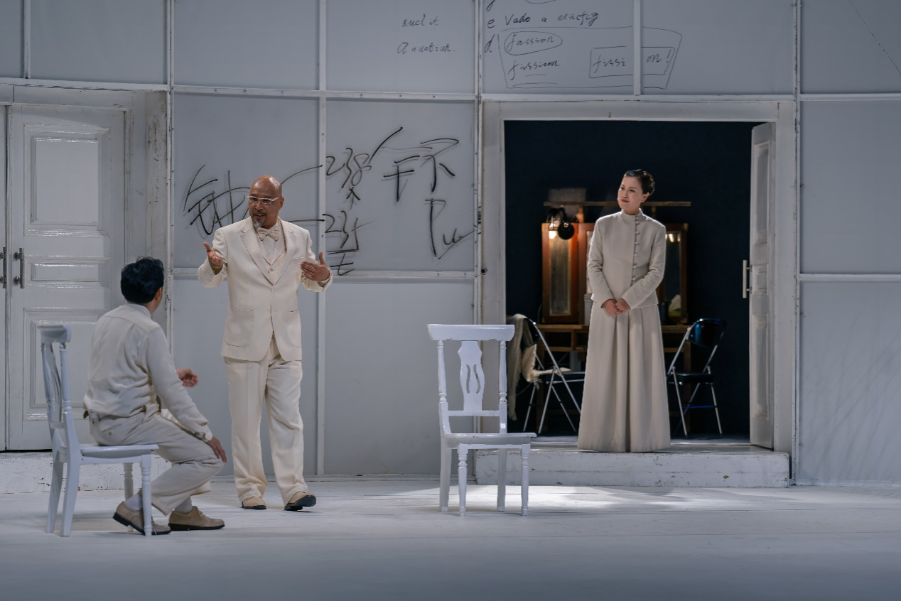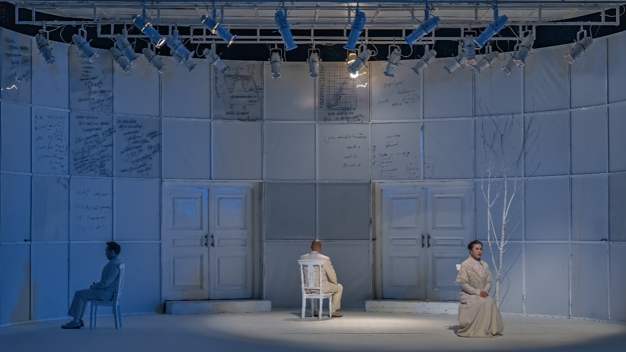 话剧围绕德国物理学家海森堡和丹麦物理学家波尔及其夫人玛格丽特在1941年的哥本哈根会晤展开,探讨了科学与伦理、历史与责任的深刻主题。三把椅子、二扇门、一枝树枯,构成了一个充满神秘色彩的对话空间。三名演员身着纯白服装,以对话为桥梁,开始了一次又一次的回忆、叙事和呈现,展现了二战背景下科学家们在道德抉择与心灵挣扎中的深刻冲突。《哥本哈根》就是用艺术的方式,将无法用常规叙事讲述的内容,容纳并置于舞台的空间,以此来重回历史现场,不断演示、假设、展现历史迷思的可能解释。